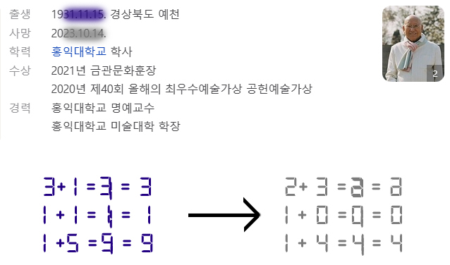 나는 인연이 있던 원로 화백의 스튜디오에서 수집한 폐기물과 그것을 곱게 채반에 쳐내 얻어낸 미세한 입자, 즉 '먼지'를 활용하여 그의 존재와 예술적 부산물을 성찰하고자 했다. 작업은 고인이 되신 원로 화백의 사진이 출력된 캔버스 위에 이 폐기물 입자를 부착하고, 그의 출생년월일(311115)과 사망년월일(231014)을 중첩(3+1, 1+1, 1+5 … 2+3, 1+0, 1+4)하여 만든 세 자리 기호를 함께 제시하는 방식이었다. 이는 시간적 사건을 압축하려는 조형적 개입인데, 특히 기호의 색상은 보라색이 한 존재의 유한한 삶의 시작을 표상한다면, 흰색으로 표현된 기호는 삶의 끝과 동시에 그 너머의 이야기를 내포한다. 흰색은 소멸이나 부재가 아니라, 오히려 우리의 시각적 인지를 벗어났을 뿐 다른 차원에서 여전히 '있음'을 상징하는 차원 이동의 표식이다. 결국 이 작품은 한 존재의 끝이 완전한 소멸이 아닌 무한한 순환으로 이어질 수 있다는 가능성을 제시하며, 작품의 부산물인 먼지가 고인의 삶과 예술을 연결하는 매개체가 되어, 죽음 이후에도 이어질 수 있는 존재의 흐름의 가능성을 표현해 보고자 했다.