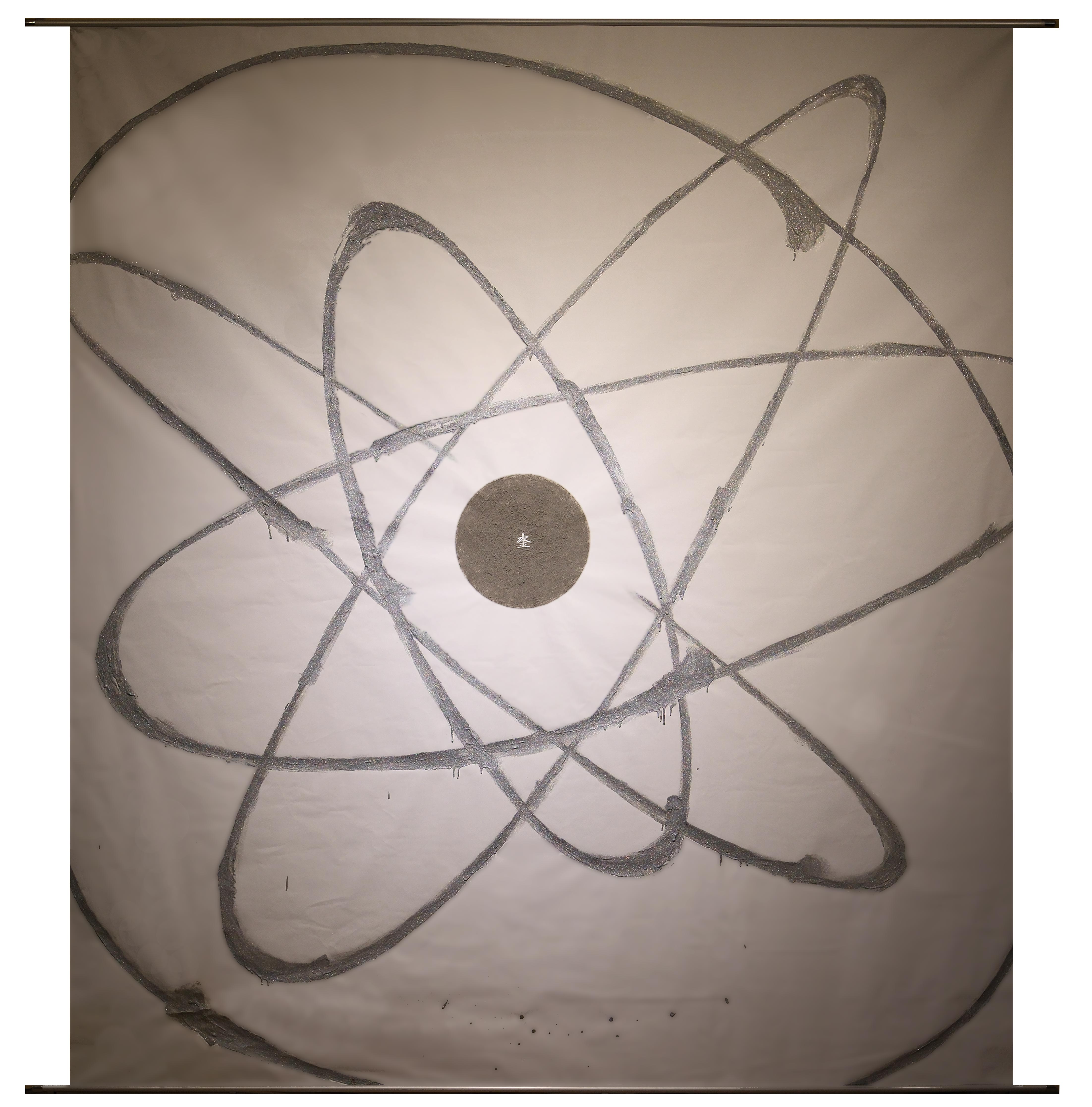 이러한 문제의식은 과학과 동양 철학이라는 서로 다른 인식 체계의 경계를 허물고 '중첩'시키는 형식 실험으로 이어졌다. 나는 원형 캔버스 위에 물질의 기본 단위를 상징하는 과학적 도상으로서의 원자 모형과 우주의 질서 및 순환을 나타내는 태극 문양 및 동양 철학의 오행 기호를 결합했다. 특히 원자 모형으로 현대의 양자구름 모델 대신 이미 폐기된 모델인 러더퍼드 모델을 의도적으로 변형하여 사용한 것은, 과학 지식 역시 고정불변의 진리가 아니라 시대에 따라 끊임없이 수정되고 변화하는 가변적인 체계라는 점에 주목한 결과였다. 이는 특정 시점의 '정확한' 과학 모델을 재현하기보다, 오히려 지금은 '구식'으로 여겨지는 모델을 가져와 변형함으로써 과학 지식 자체의 역사성과 상대성, 즉 시간 속에서의 변화 가능성을 암시하고자 했으며, 이는 물질과 인식의 근본적인 유동성 및 변화 가능성이라는 주제와 자연스럽게 연결되었다. 전자의 유동적인 상태는 홀로그램 글리터로 표현되어 그 끊임없는 운동과 예측 불가능성을 시각적으로 나타내고자 했다.