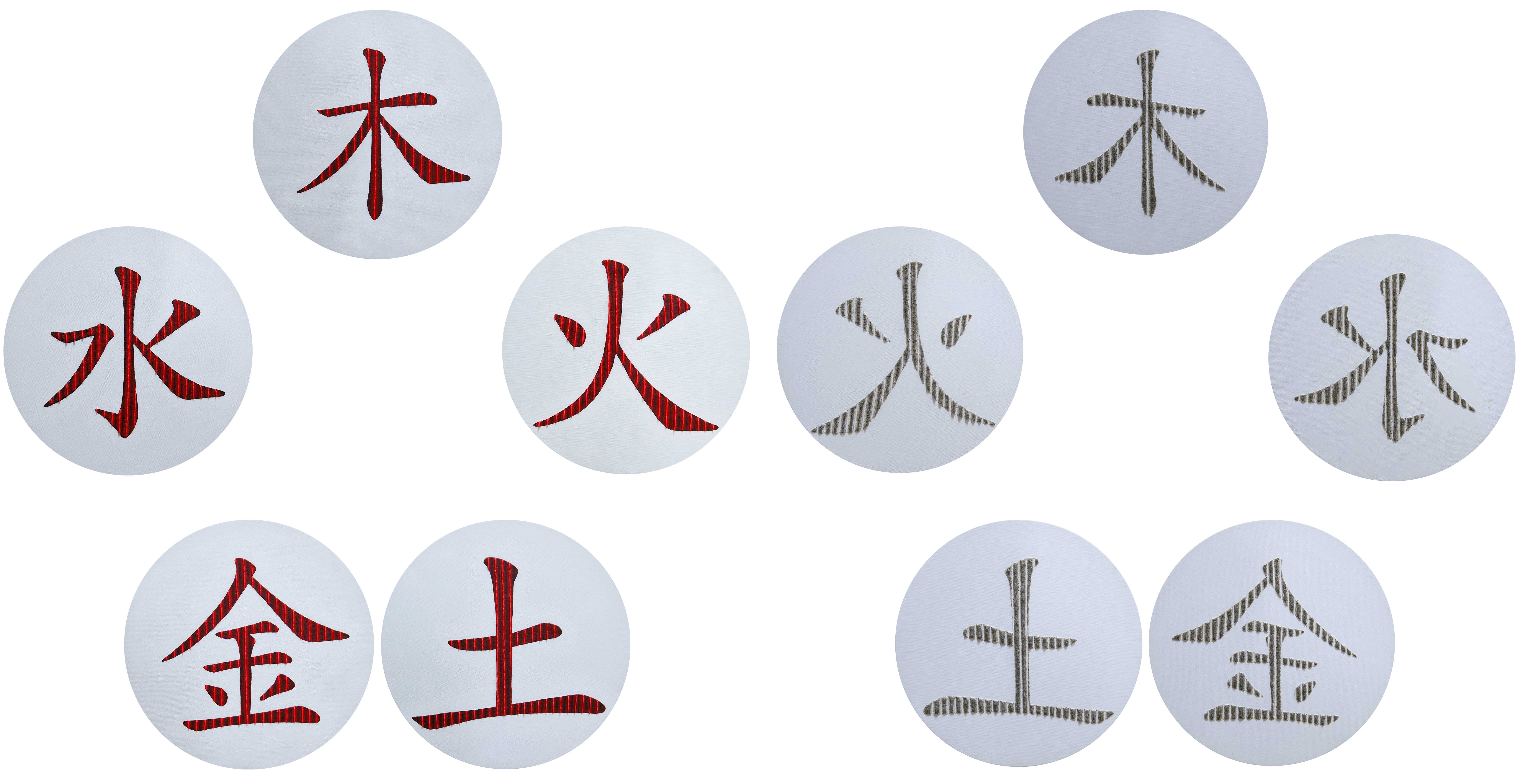 더욱 중요한 것은 원자핵을 표현하는 방식에 나타나는 '중첩' 전략이었다. 나는 <원형의 음각>에 먼지와 같은 '탈락된 입자'를 직접 사용하기도 했지만, 다른 작업인 <공기색 입자_평면>에서는 木(목), 火(화), 土(토), 金(금), 水(수)의 오행 한자들을 가독성을 파괴하여 '중첩'시켜 하나의 기호로 표현했다. 이는 물질의 가장 근본적인 차원에서도 본질적인 변화 가능성이 존재한다는 본인의 고찰과 연결되었다. 오행 체계 자체도 유동적인 사유 체계라는 점을 고려하면, 이는 과학적 모델과 동양 철학 체계가 모두 세계를 이해하려는 인간적 시도이지만, 더 이상 해체되지 않는 근원에는 본질적인 유동성이 자리 잡고 있을 수 있다는 현재의 고찰과 동시에, 그 믿음 또한 시간이 지나면 개념적 타당성이 미래엔 파괴될 수 있음을, 과학은 끊임없이 변화하는 학문이며 언어는 시간에 의해 의미의 맥락이 미묘하게 달라질 수 있다는 속성을 지닌다는 성찰을 통해, 전통의 시선, 즉 초기 원자 모델의 변형이나 오행 한자의 사용을 교차시켜 암시하고자 했다. 중첩된 오행 문자의 내부를 비워두는 방식 역시 이러한 우주에 관한 진실, 다시 말해 실체나 정체의 본질적인 유동성, 즉 세계의 궁극적 진리를 알 수가 없다는 인식적 성찰과 무한한 변화 가능성을 함의하는 장치였으며, 이는 언어 및 인식 체계의 변화 가능성 문제와 연결되었다.