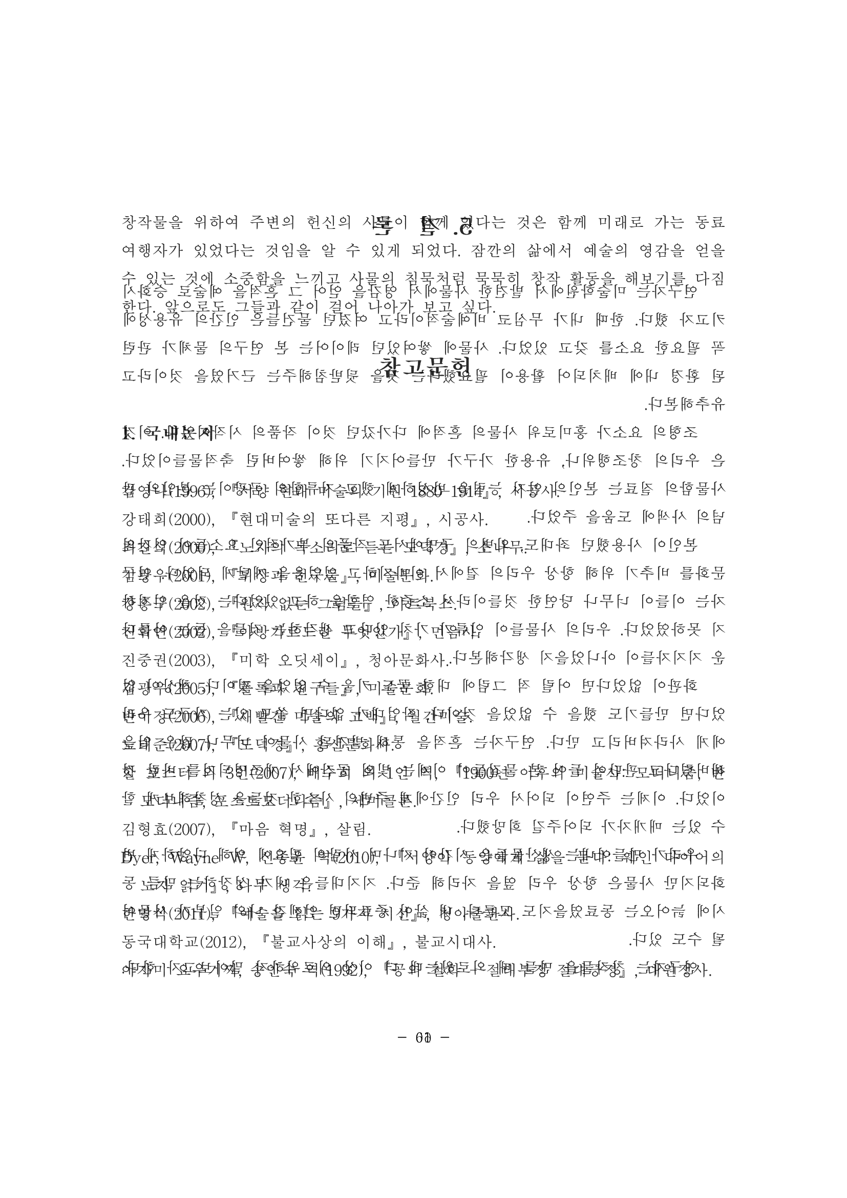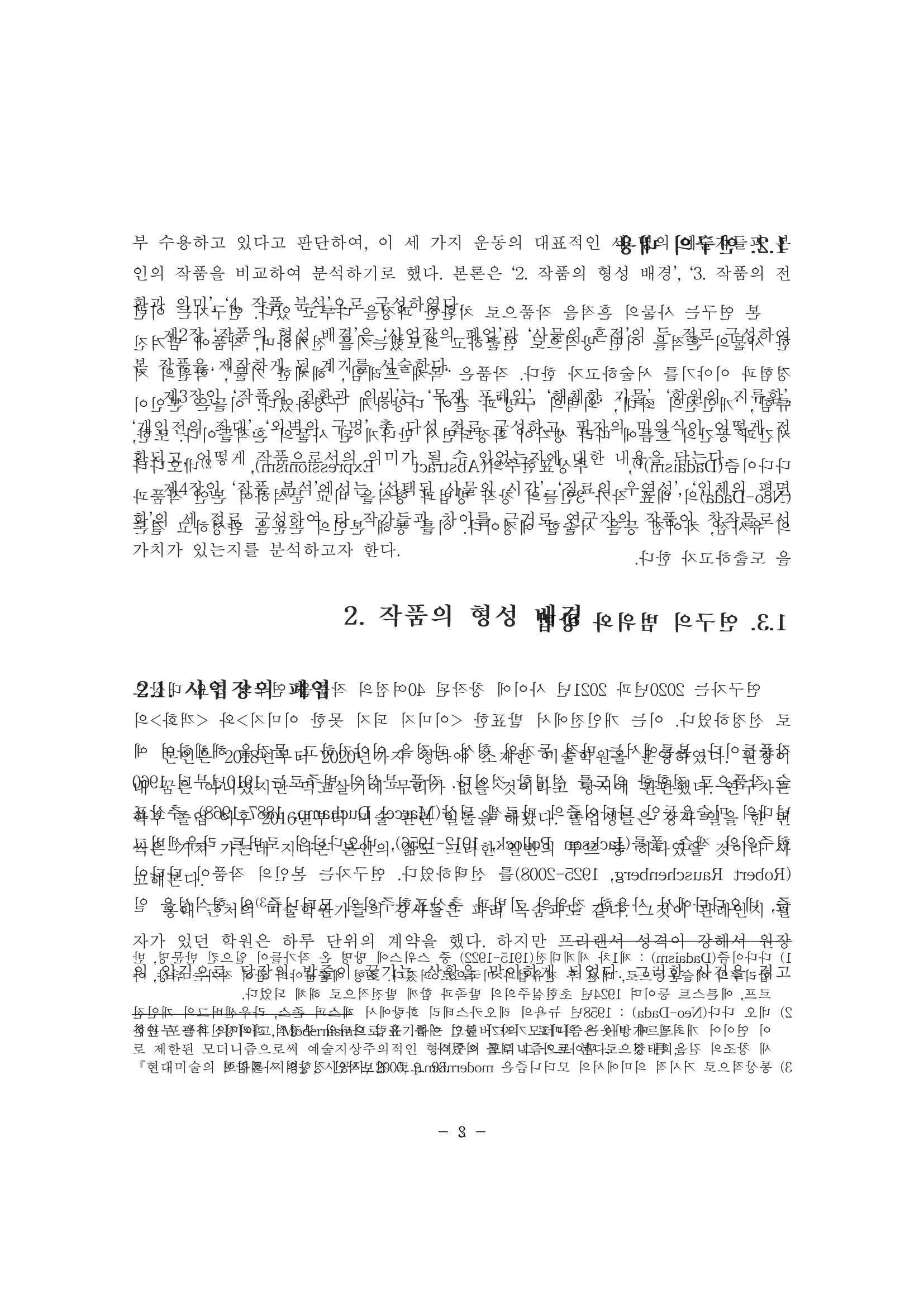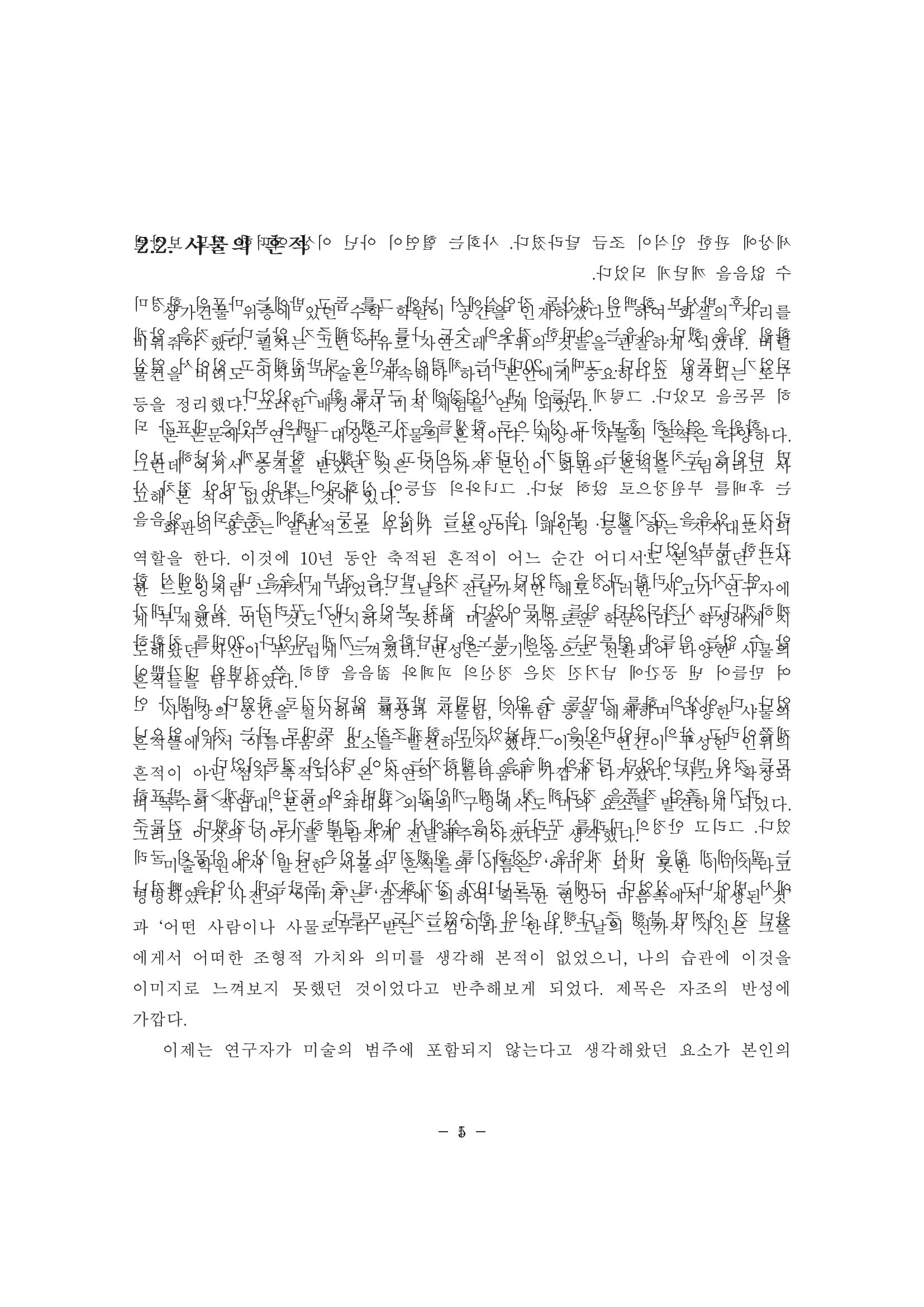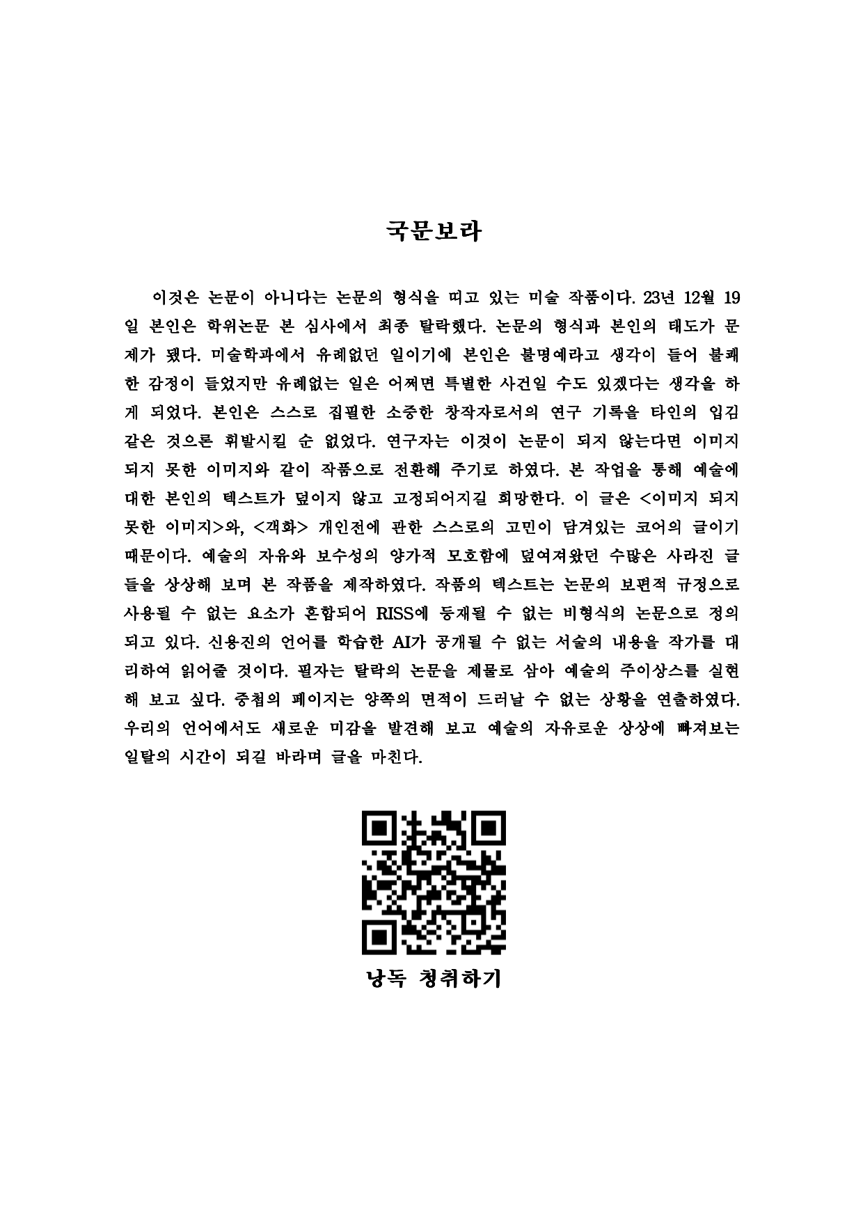 나는 모교 미술학과 학위 심사에서 탈락했던 글을 모아 마치 논문처럼 제본한 작품을 만들었다. 예술의 자유와 보수성 사이에서 생겨난 학술적 제도의 아이러니에 의문을 품게 되었고, 학위 논문으로 인준되지 못한다면 텍스트 전체를 '작품'으로 사수하고자 했다. 겉으로는 논문의 형식을 따르지만, 책을 펼치면 양쪽 장이 중첩되어 있어 언어를 읽는 방법으로는 독해가 불가능하다. 이는 구어체를 이유로 '비형식의 논문'으로 정의된 채, 독자에게 드러날 수 없는 책의 내부 상황을 연출한 것이다. 첫 장에는 '국문보라'가 있는데, 이는 '국문초록'을 비틀어 만든 것으로, 국문으로 제작한 이 작품을 읽지 말고 눈으로 '보라'는 의미와 초록색을 보라색으로 치환한 유희를 담았다.