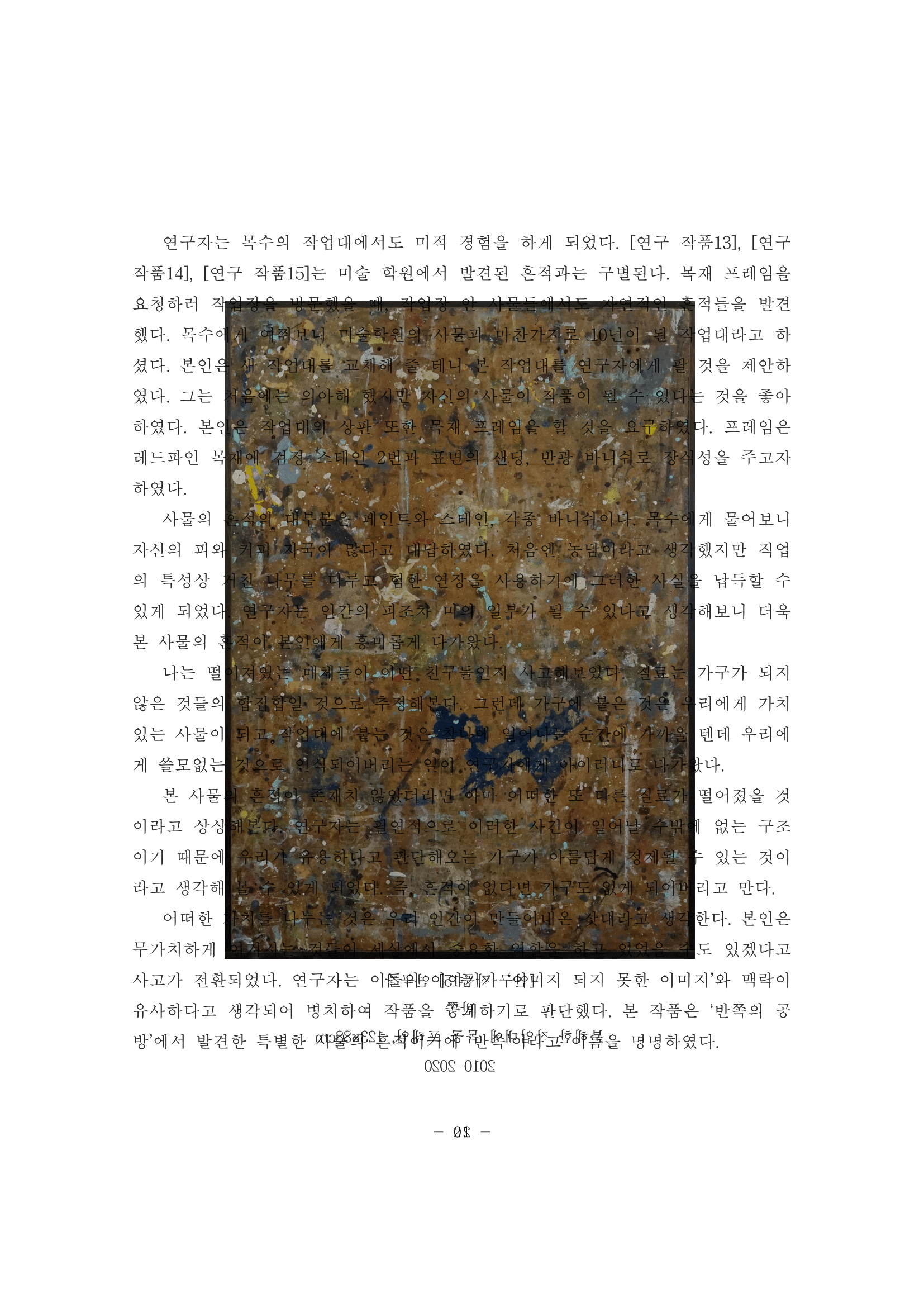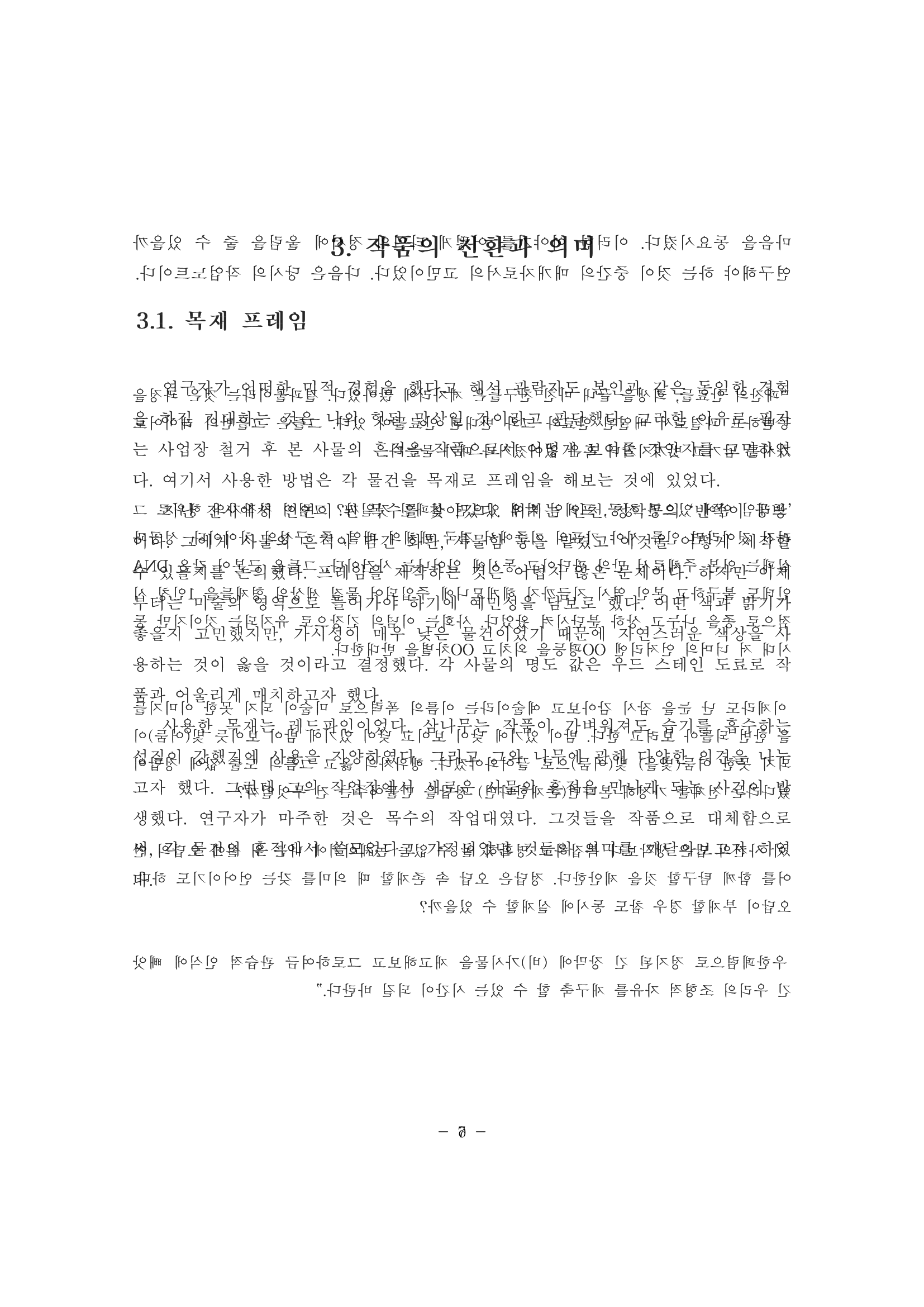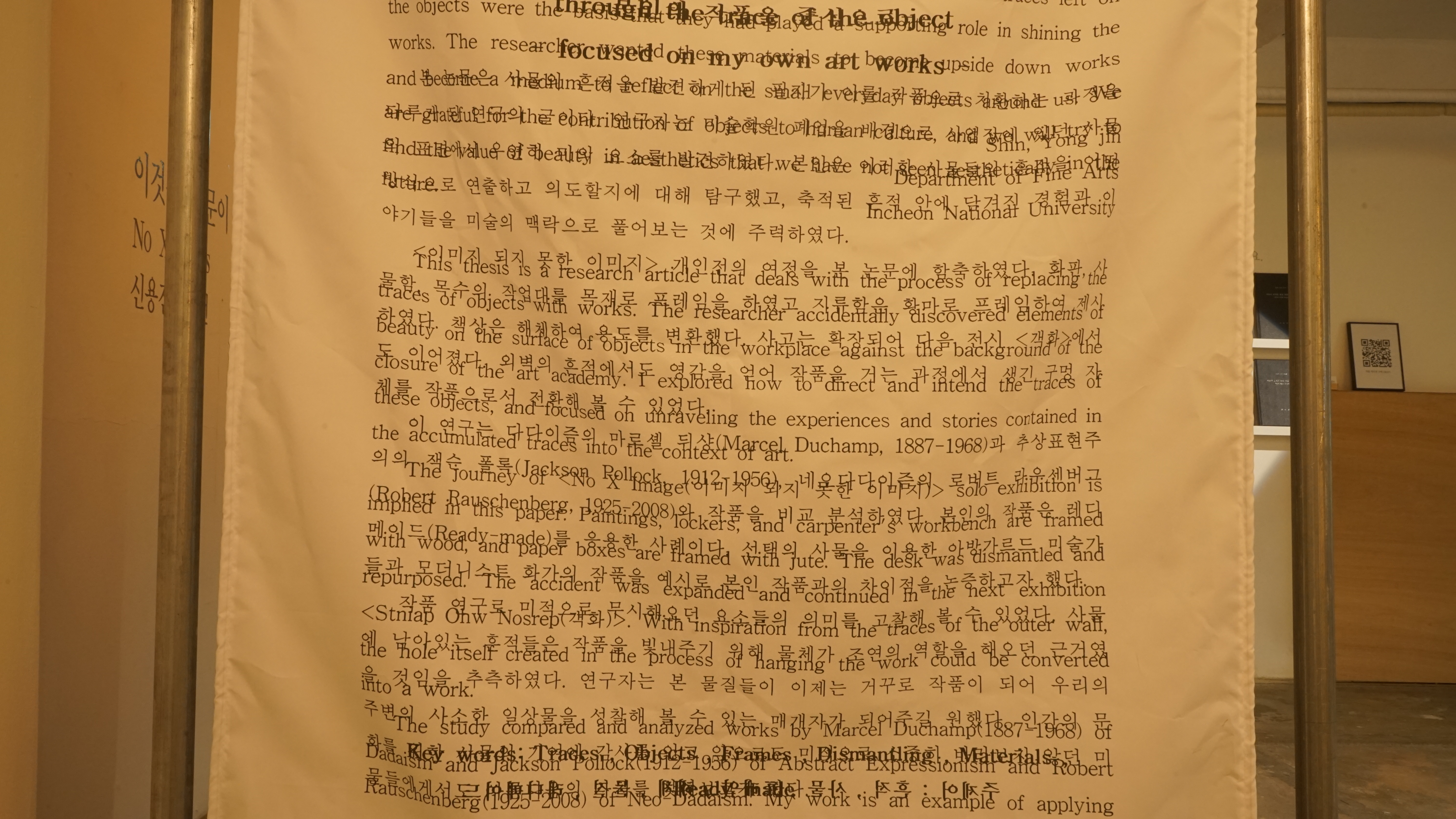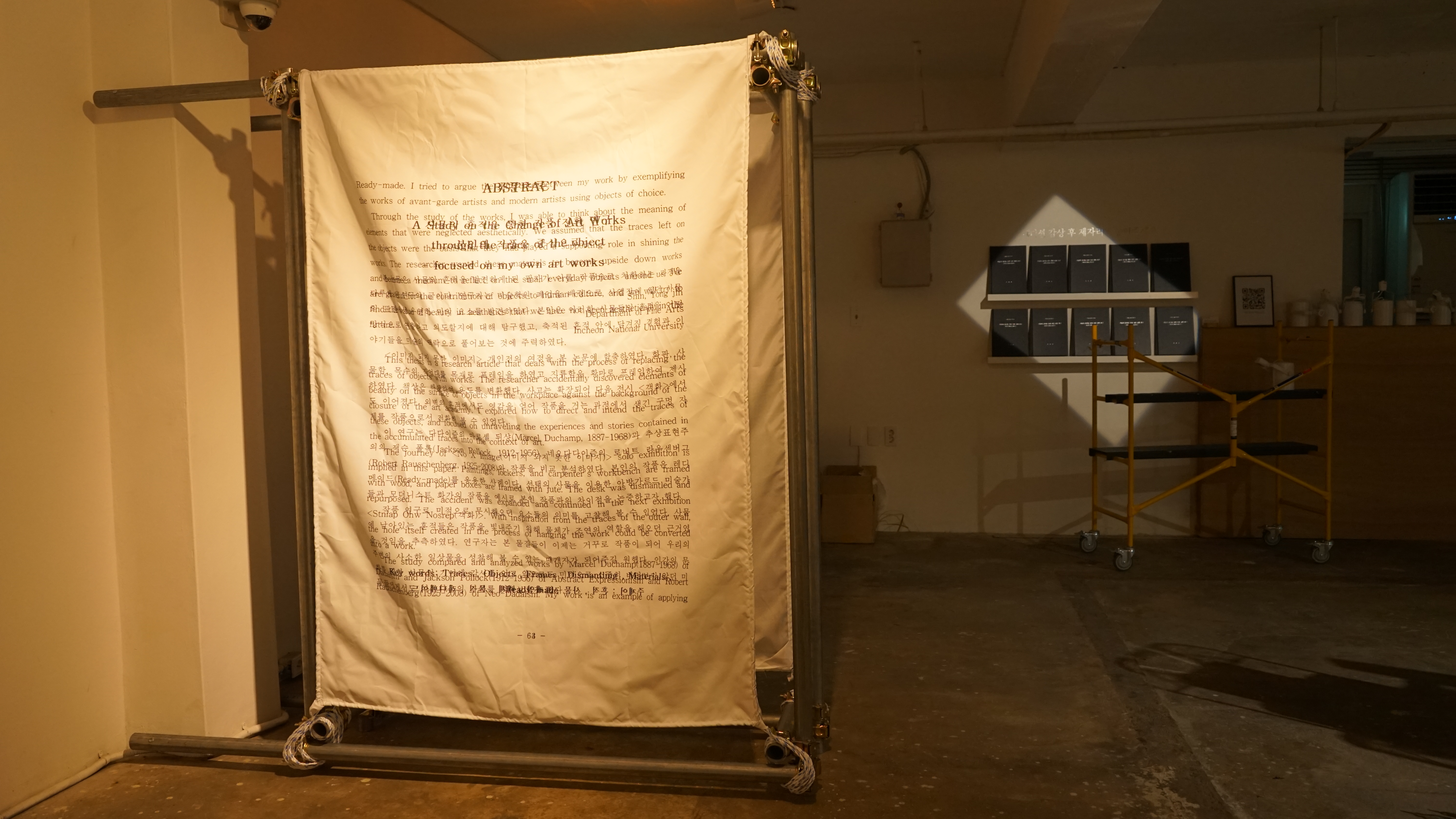 더 나아가, 이 연작은 작품과 비작품, 내부와 외부의 경계를 질문하는 성찰과도 연결되었다. 탈락한 논문이라는 '비예술적' 텍스트가 예술 작품의 '내부'로 들어오고, 논문이라는 규범적 '틀' 자체를 차용하거나 텍스트를 물리적으로 해체하여 전시 공간이라는 또 다른 '틀' 안에 배치함으로써, 무엇이 작품의 본질이고 무엇이 부수적인 요소인지, 그리고 그 사이의 경계는 과연 명확한 것인지에 대한 의문을 촉발해 보고자 했다.