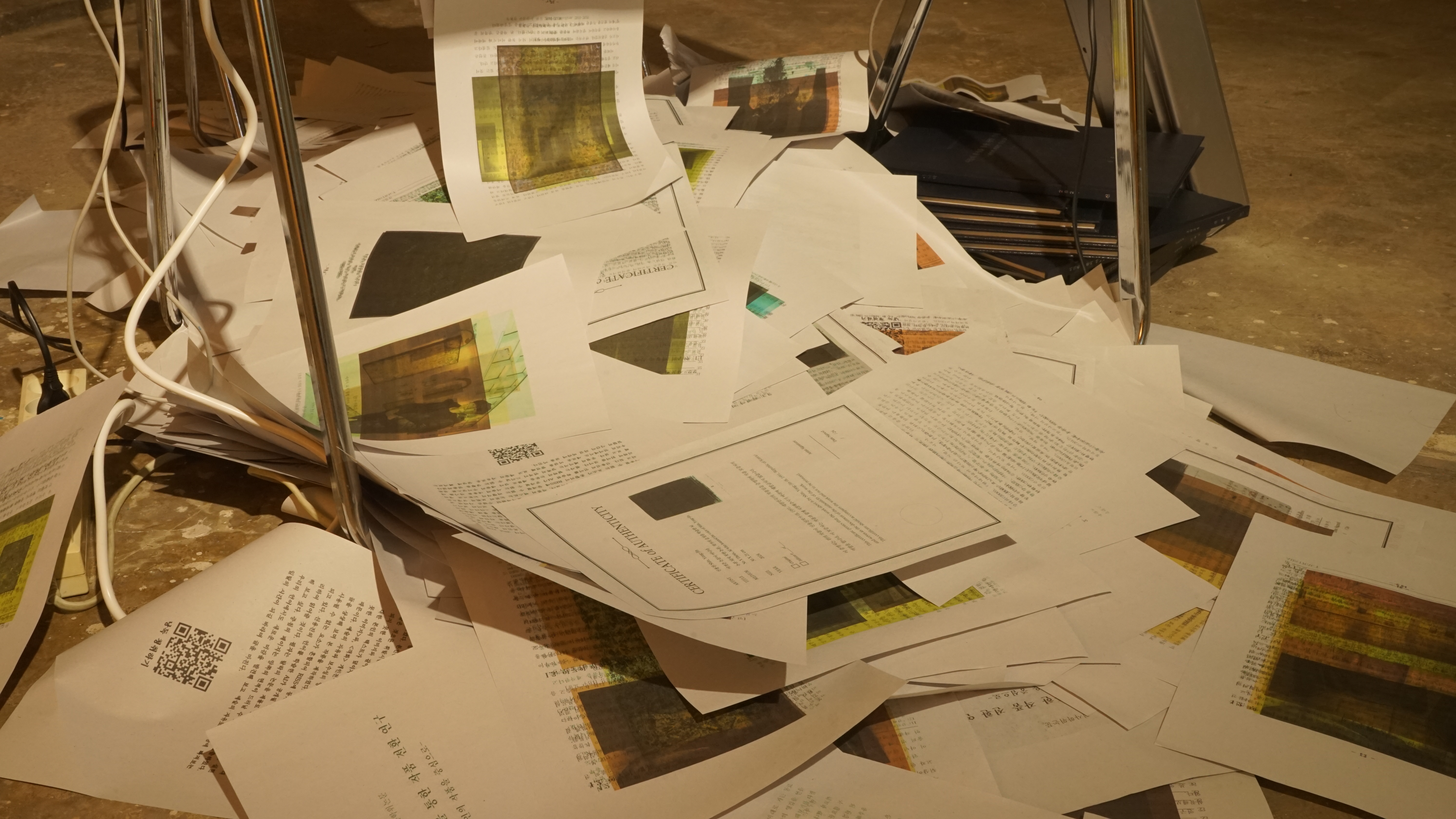 여기에 더해, 프린터기에 '비형식의 논문'으로 정의된 페이지를 넣으면, 그것이 출력되고 다시 프린터기에 삽입되는 설치 버전 <낭독자와 판화 뱉는 자>를 선보였다. 이 과정을 반복할수록 페이지들은 무작위로 중첩되며, 언어는 점차 조형화되었다. 무작위로 중첩된 페이지를 끊임없이 출력하고 그 결과물을 다시 투입하는 순환 과정을 보여주는 이 작품은 '쓸모없다고 인식된' 텍스트 데이터가 해체되고 물질화되는 과정 자체에 주목하게 하는 장치이다.