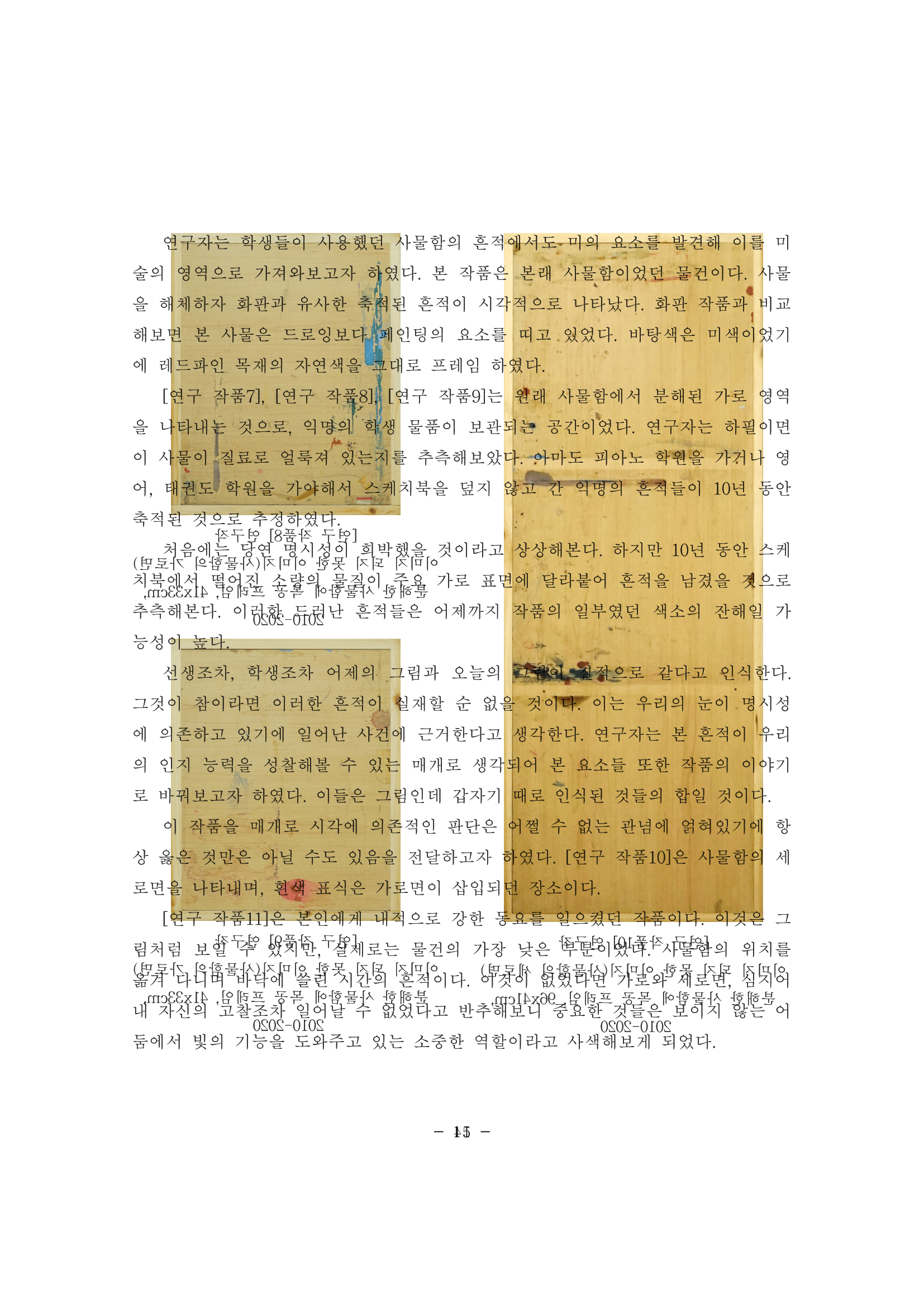 이러한 페이지 '중첩' 기법은 언어 또한 오해를 불러일으킬 수 있다는 전제에 대한 나의 조형적 응답이자, 언어 너머의 다른 차원의 소통 방식을 제안하는 시도로 이해될 수 있다. 기호의 뚜렷한 지시 모양에도 불구하고 언어의 의미론적 속성에 오독성이나 해석가능성의 여지가 필연적으로 공존할 수밖에 없다면, 명료성에 대한 기대를 저버리고 오히려 텍스트의 물질성과 시각성에 주목하는 조형 언어가 언어적 의미 해독과는 다른 종류의 소통, 즉 텍스트와의 물질적 만남을 통해 언어적 질서 문제를 고찰해 보는 새로운 가능성을 열어줄 수 있다는 것이 논리의 근거였다. 나는 이를 통해 학술 제도의 기대를 떠나보고, 이것이 곧 미술의 방법이라는 함의를 내포하고자 했다. '중첩'된 텍스트를 통해 의미 해독의 좌절과 동시에 물질적 현존감을 지각하게 하며, 언어적 독해를 의도적으로 배반하여 관객이 텍스트의 물질성, 중첩된 형태의 복합성, 해체와 생성의 과정 자체를 감각해 볼 수 있도록 유도하고자 했다. 이는 명료한 의미 전달의 믿음과는 다른 차원의 감각적 경험을 실험하려는 조형적 모색이었다.
